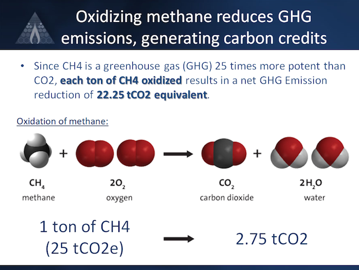 As the abatement of VAM is not mandatory, the main incentive to implement VAM abatement projects in the U.S. is the generation of carbon credits. Indeed, since methane is a greenhouse gas (GHG) 25 times more potent than CO2, GHG emissions can be reduced by simply capturing and oxidizing methane. Hence, each ton of methane oxidized results in a net emission reduction equivalent to 22.25 tCO2e.