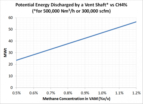 Despite its low methane concentration, VAM contains a lot of energy! A typical shaft venting 300,000 scfm (500,000 Nm3/hr) of VAM at 1%v/v contains close to 50 MWt of potential energy wasted to the atmosphere (see graph below). The Vamox® Regenerative Thermal Oxidizer (RTO) technology is an effective way to release and value this energy.