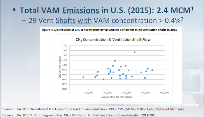 According to U.S. EPA, total VAM Emissions in the U.S. were estimated to 2.4 Million Cubic Meters of Methane (MCM) and 29 vent shafts were reported to discharge VAM at an average methane concentration high enough to be economically viable (typically >~0.4%).